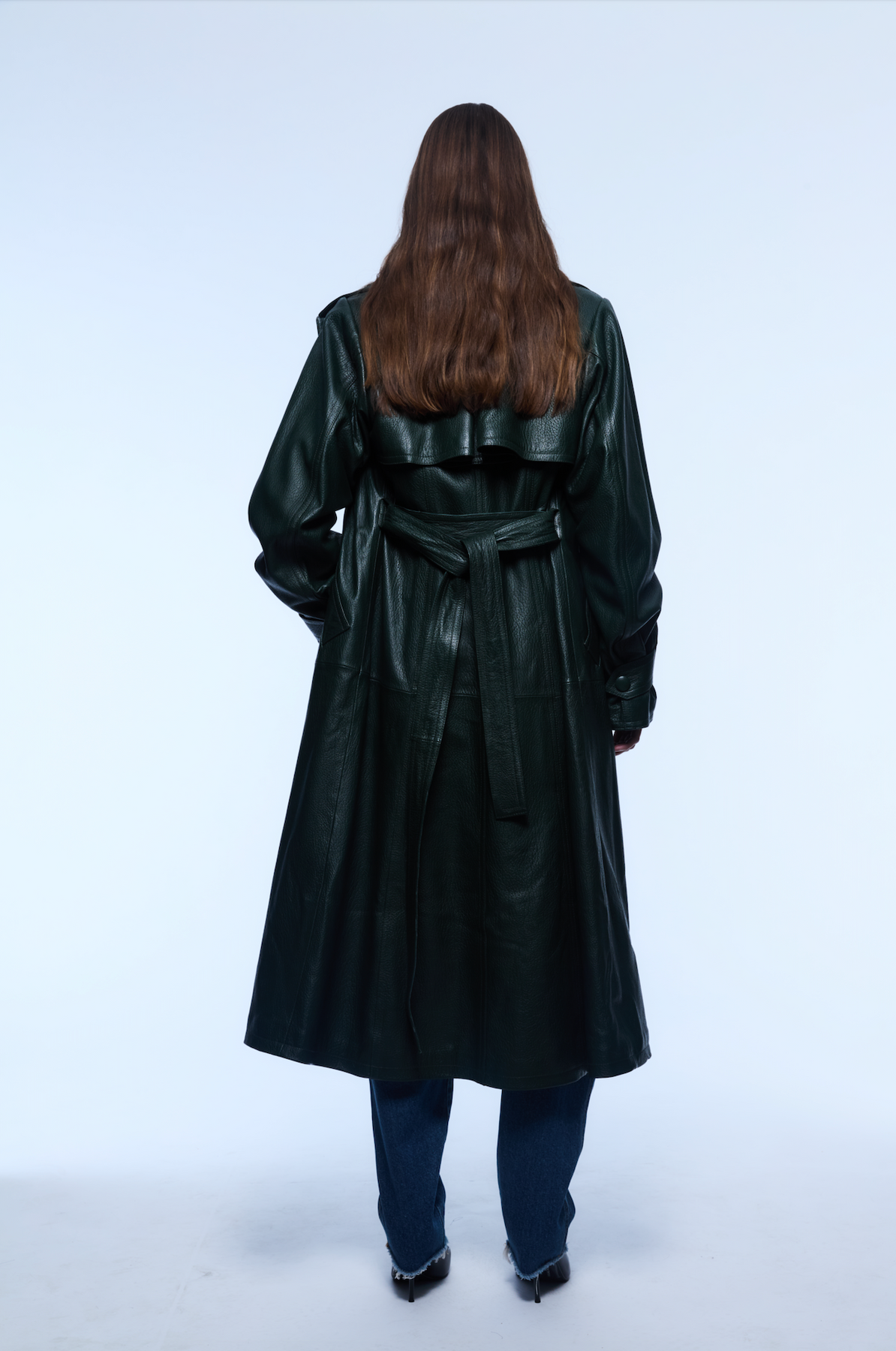 Leather trench coat.