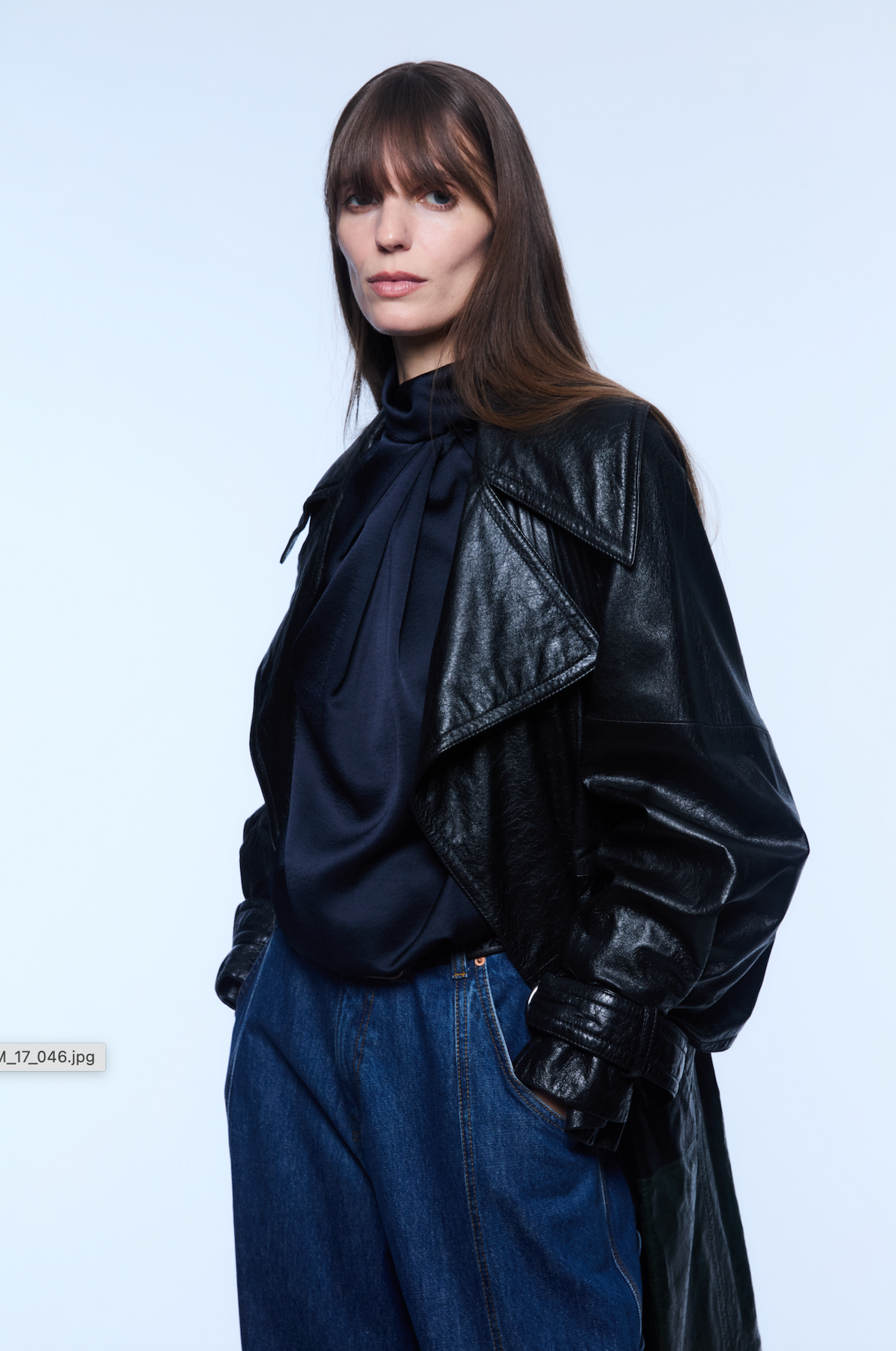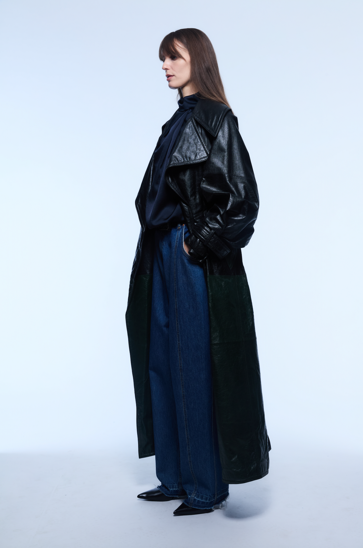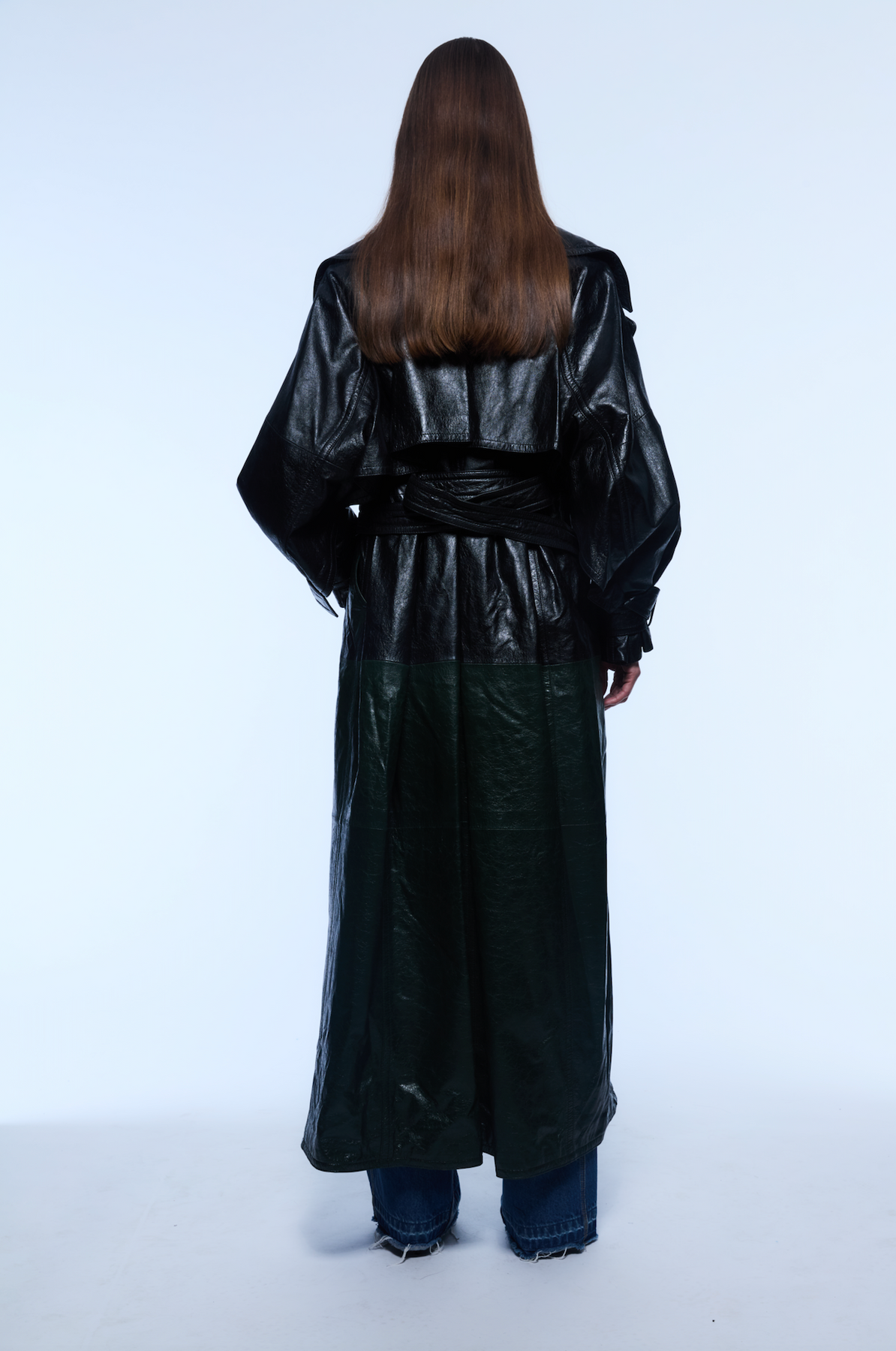Two-toned Japanese crack soft leather trench with cape detail in the back.