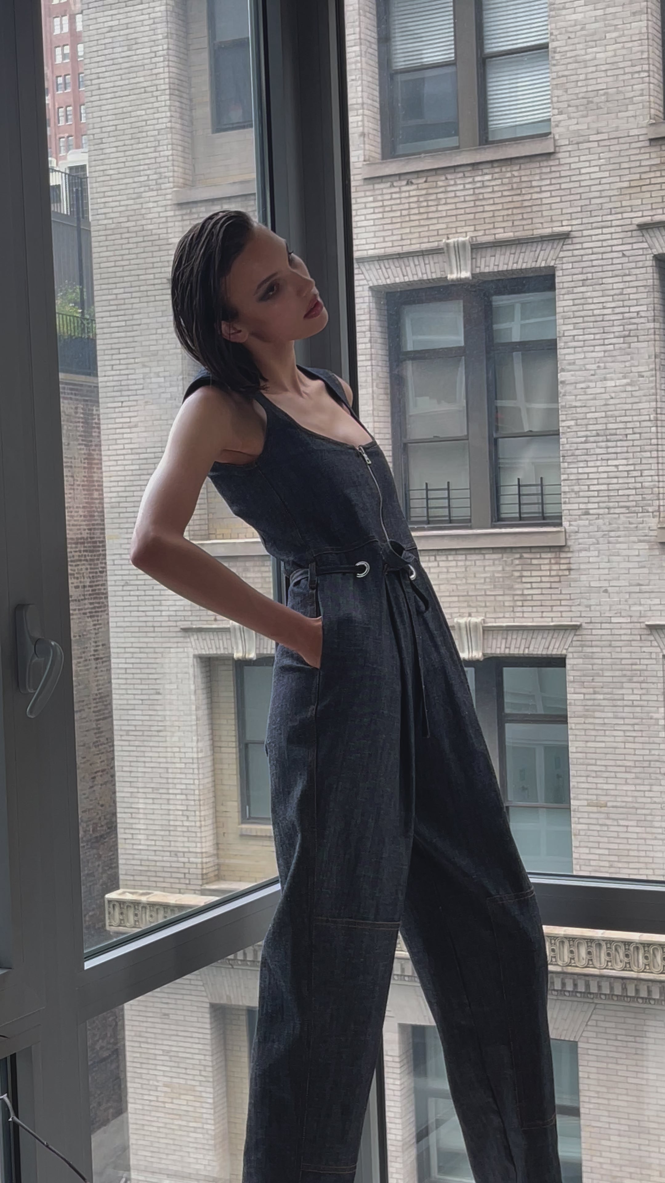 This jumpsuit features a bustier top with a paper bag pant shape. Some details include a silver front zipper and front tie along with a raw hem finish.